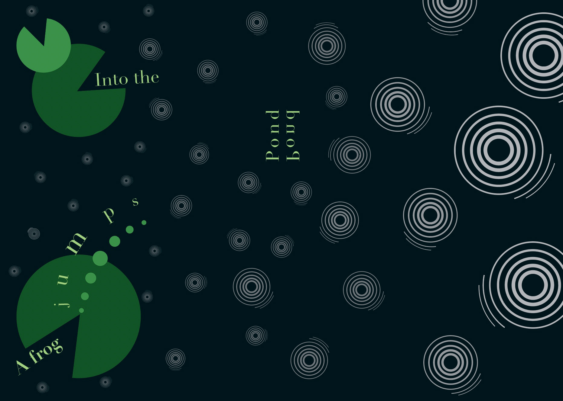 An Old Silent Pond is typographic and visual sequence that takes form in an eight page booklet. This sequence is based off of the haiku written by Matsuo Basho, where he explains his idea of the subconscious mind by using the frog character and pond setting as metaphors.