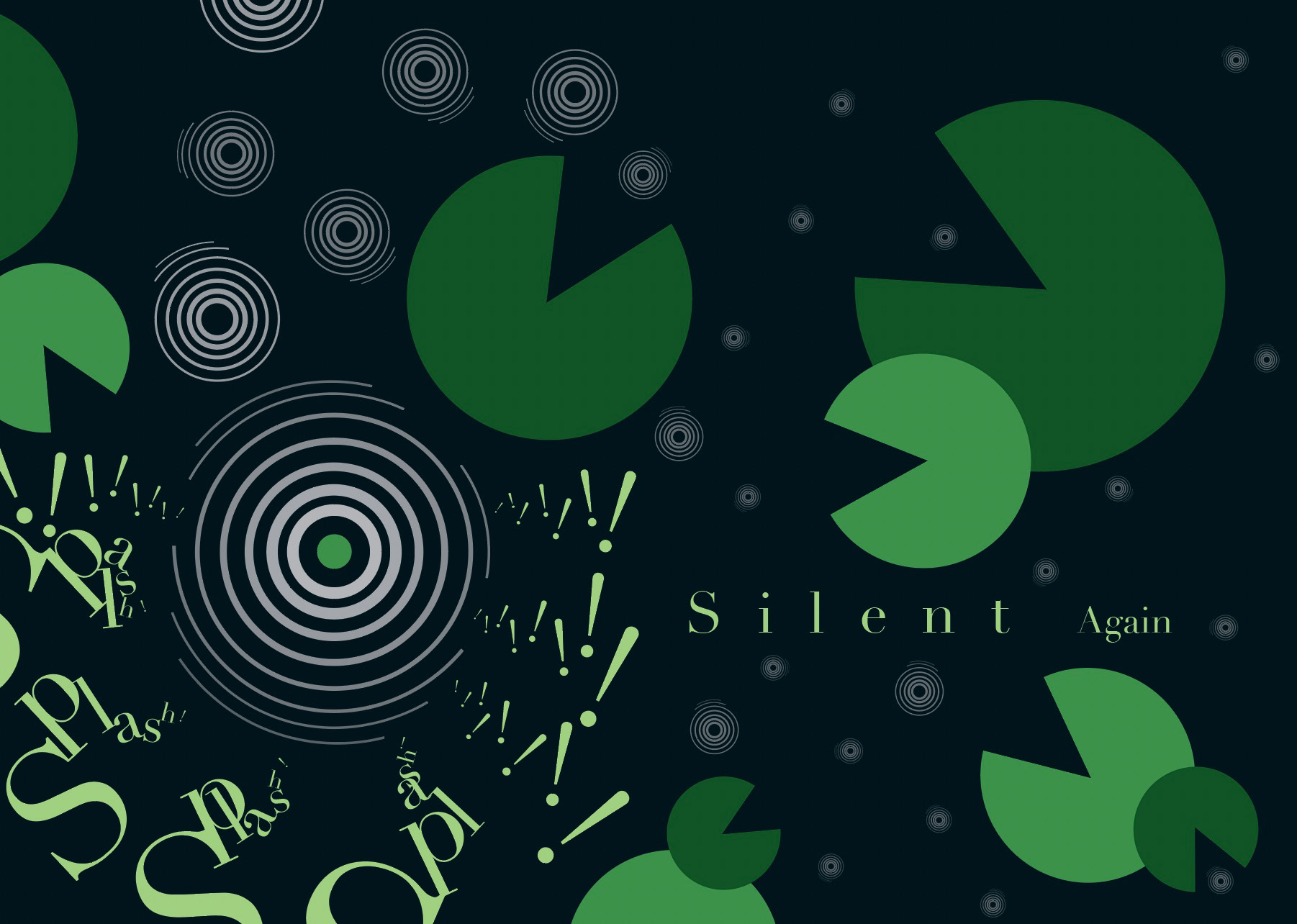 In the final spread, the last line of the haiku is introduced. The visible shift from the last spread reaches a dramatic climax in this current one. The frog, represented by the saturated leafy-green arc, is seen causing this disruption and the silence there once was is gone. The silence is not gone for long though. As the eye moves across the spread, water ripples begin to shrink and fade, the frog disappears below the water surface, and lily pads go down in number. The chaos of the disruption seems to return back to the tranquil environment it once was.