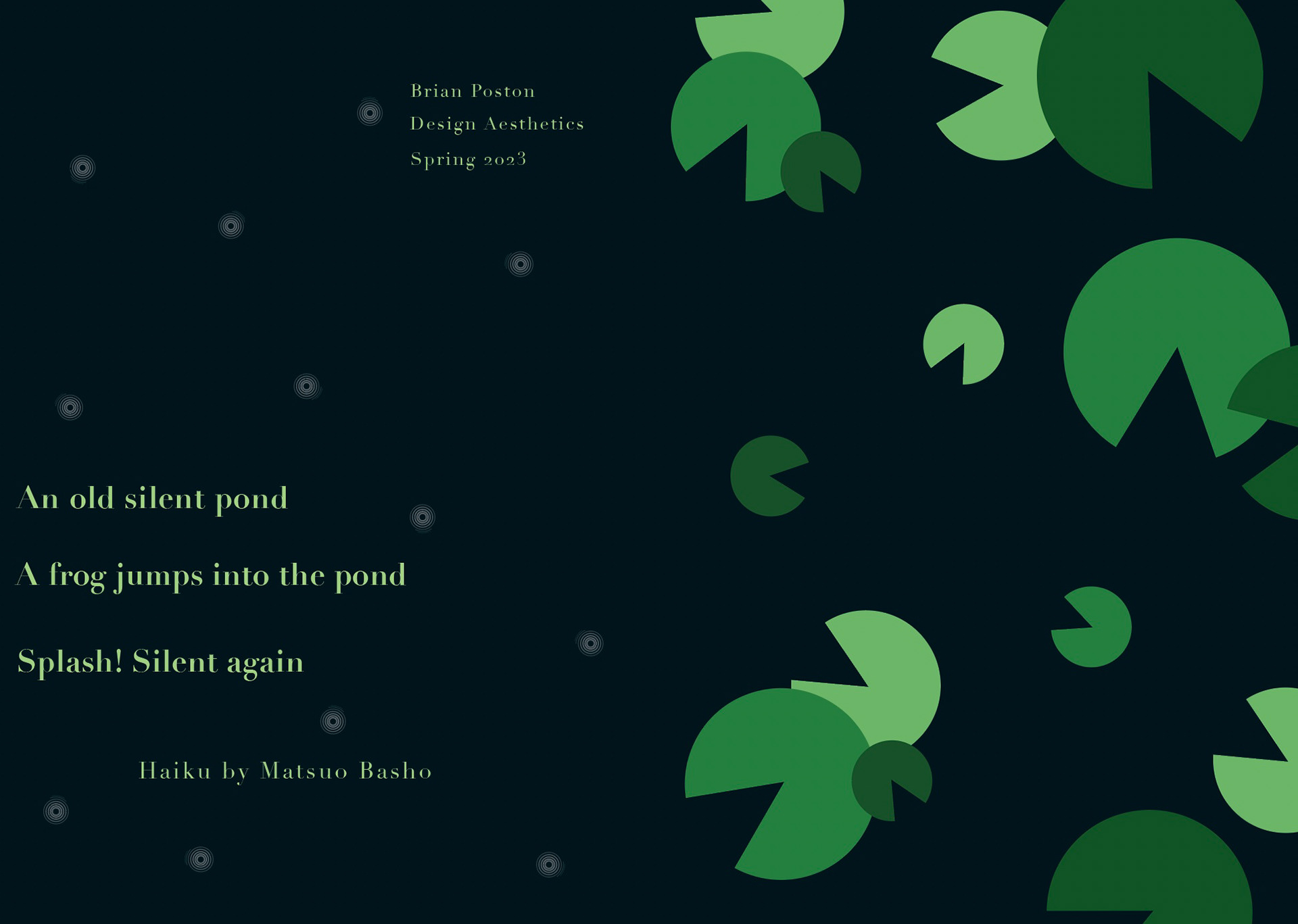 While selecting the colors that would be used in the booklet, I wanted to hint back to the frog referenced in the haiku. I ended up choosing a more light leafy-green to achieve this. Going off from this initial selection, I based the rest of my color choices off of the green by using different hues. This color palette also emphasizes the outside setting of the haiku and furthermore helps viewers comprehend the context within.